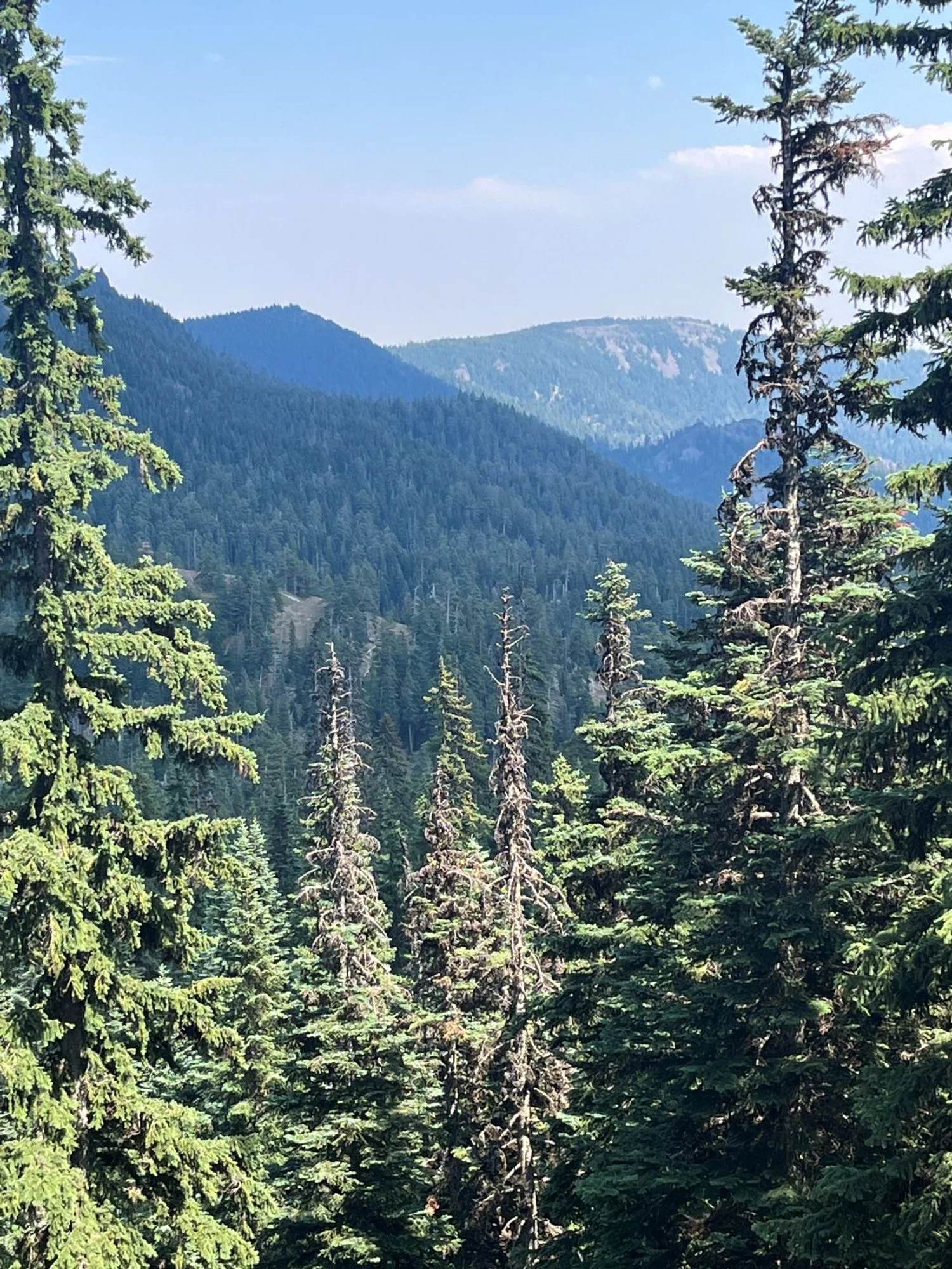 Turn right on the Badger Creek Trail (479) approximately 2 ¼ miles from the saddle heading southwest towards the cirque basin holding Badger Lake. Western redcedar makes an appearance and past blowdown is evident in places. Stay to the right (north) of the lake, ignoring paths to the left towards the campground, and intersect the Divide Trail (458) approximately 2 ¼ miles from the Gumjuwac Trail. Take the Divide Trail across the slope to the north closing the loop at Gumjuwac Saddle approximately 3 miles later. The upper portions of this last segment feature western larch, western white pine and noble fir mixing in with mountain hemlock and silver fir. Occasional openings permit views across the valley to the opposite side of the Wilderness.