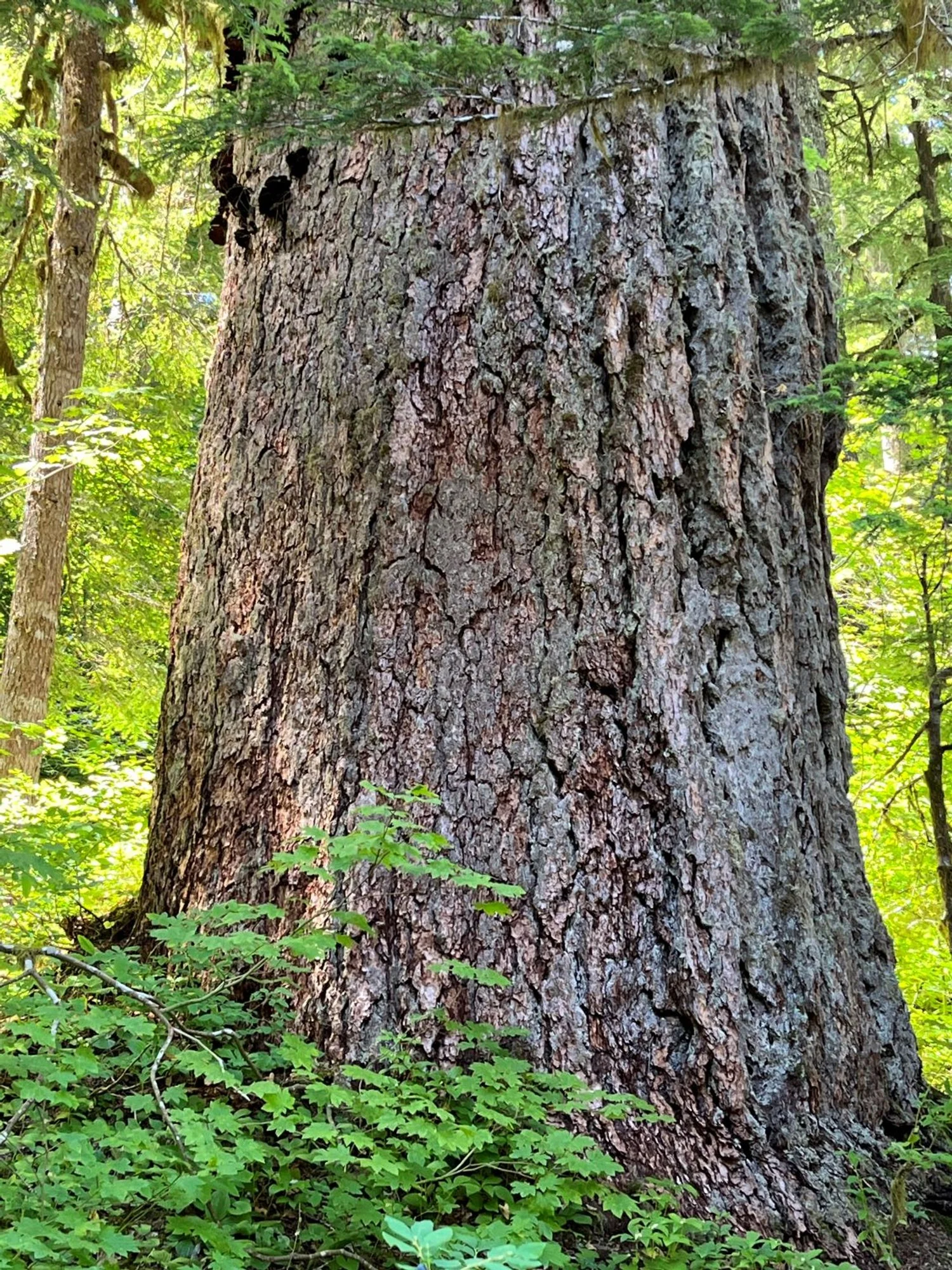 Much of the forest along this hike was severely burned by the 2017 Eagle Creek Fire and can no longer be considered old-growth. The finest stand lies at the upper margin of the fire approximately a half mile downhill from the junction of the Larch Mountain Trail (441) with the Multnomah Way Trail (444). Unfortunately, the fire burned severely through most of this stand and only a small fragment of old growth remains. The few old trees that still grow on this productive site are impressive though.