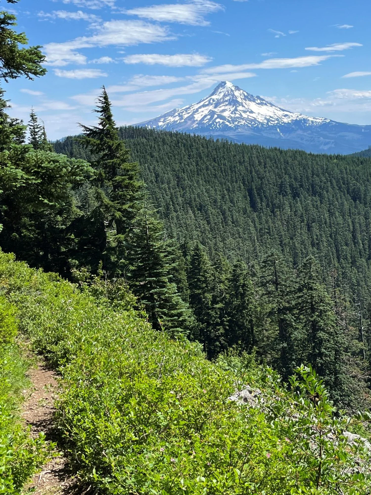 From the parking area, head uphill to the east on the Anthill Trail (406B) through stately noble fir, Douglas-fir and Pacific silver fir approximately 300-years old. After a half mile or so, small meadow and rock openings afford views over Wahtum Lake and of Mt. Hood looming over the ridge to the south. Chinidere Mountain and upper Eagle Creek, including the southern edge of the Eagle Creek Fire (2017), are also within the field of view. The trail then enters younger forest and crosses the Rainy-Wahtum Trail, which is an old road at this juncture. Note that this is the location most likely to be impacted by the Whisky Creek fireline work.