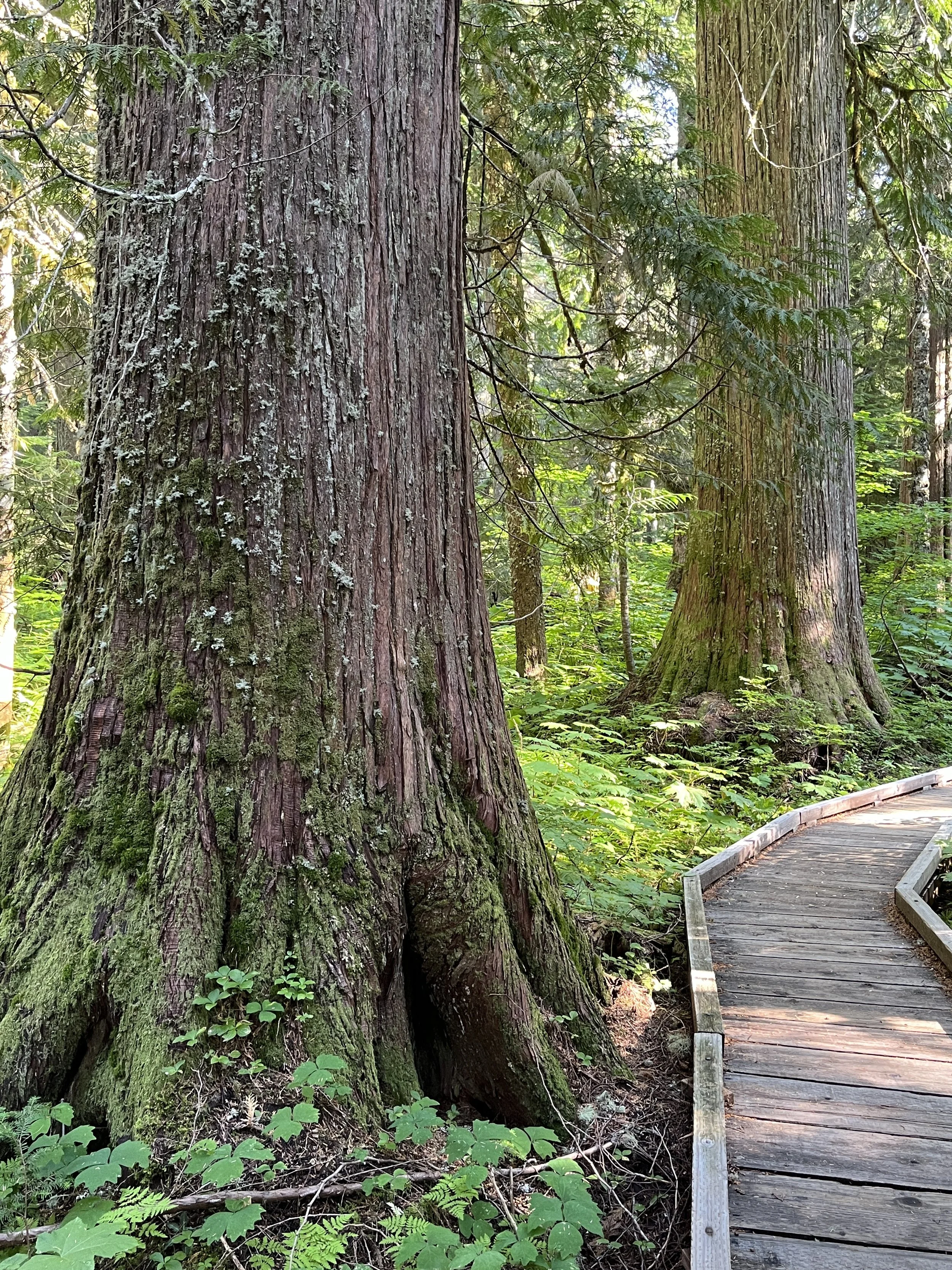 The southern portion of the trail is a single-lane boardwalk with pullouts and is particularly well endowed with a spectacular collection of colossal western redcedar and sky-scraping noble fir. The northern end is gravel surfaced and continues through impressive old growth. Most interpretative displays are located along the south end of the trail. Note that though there are not specific trailhead parking areas, the trail can be readily accessed from numerous points, including day-use parking areas and wide spots along the road.