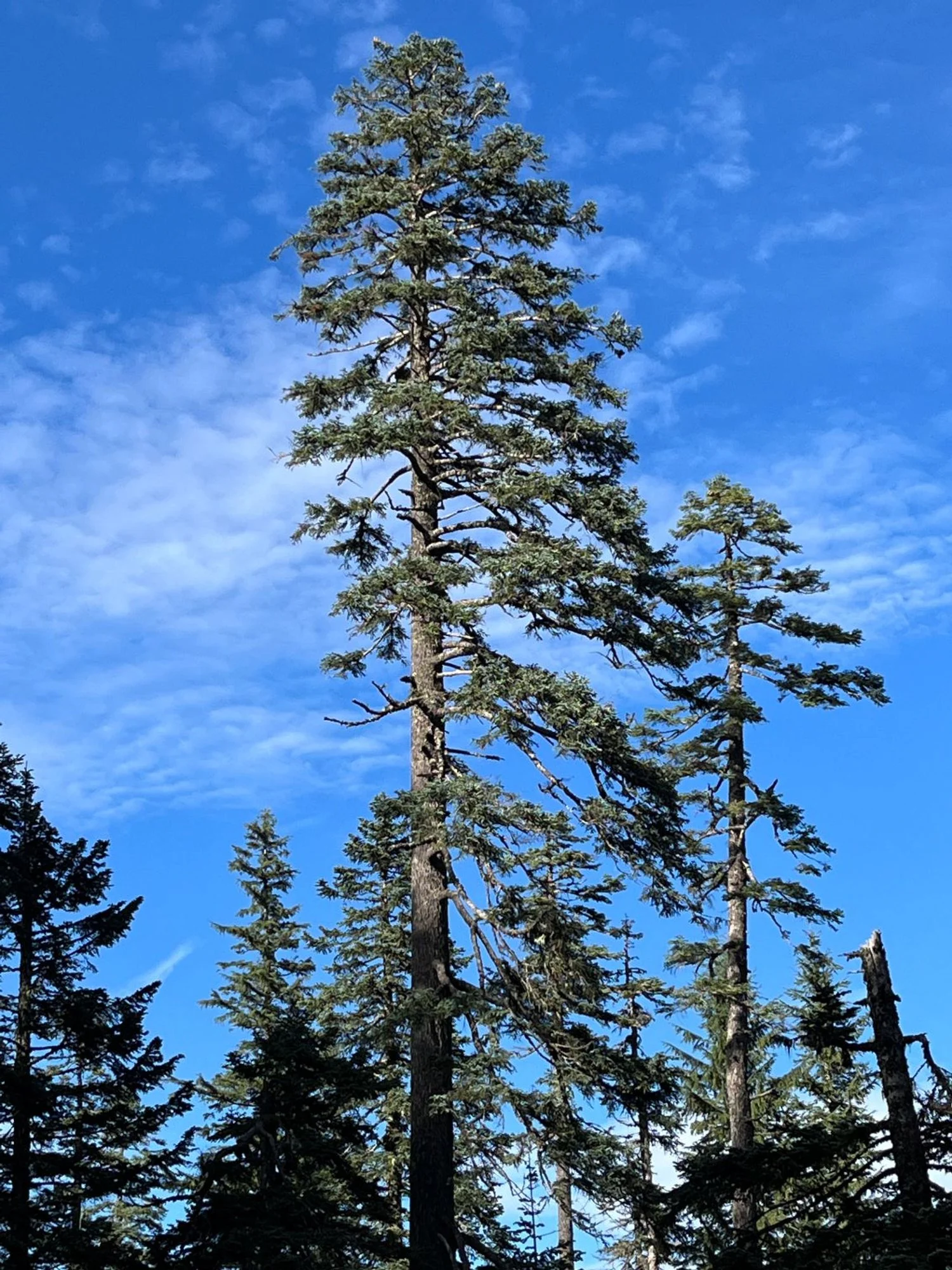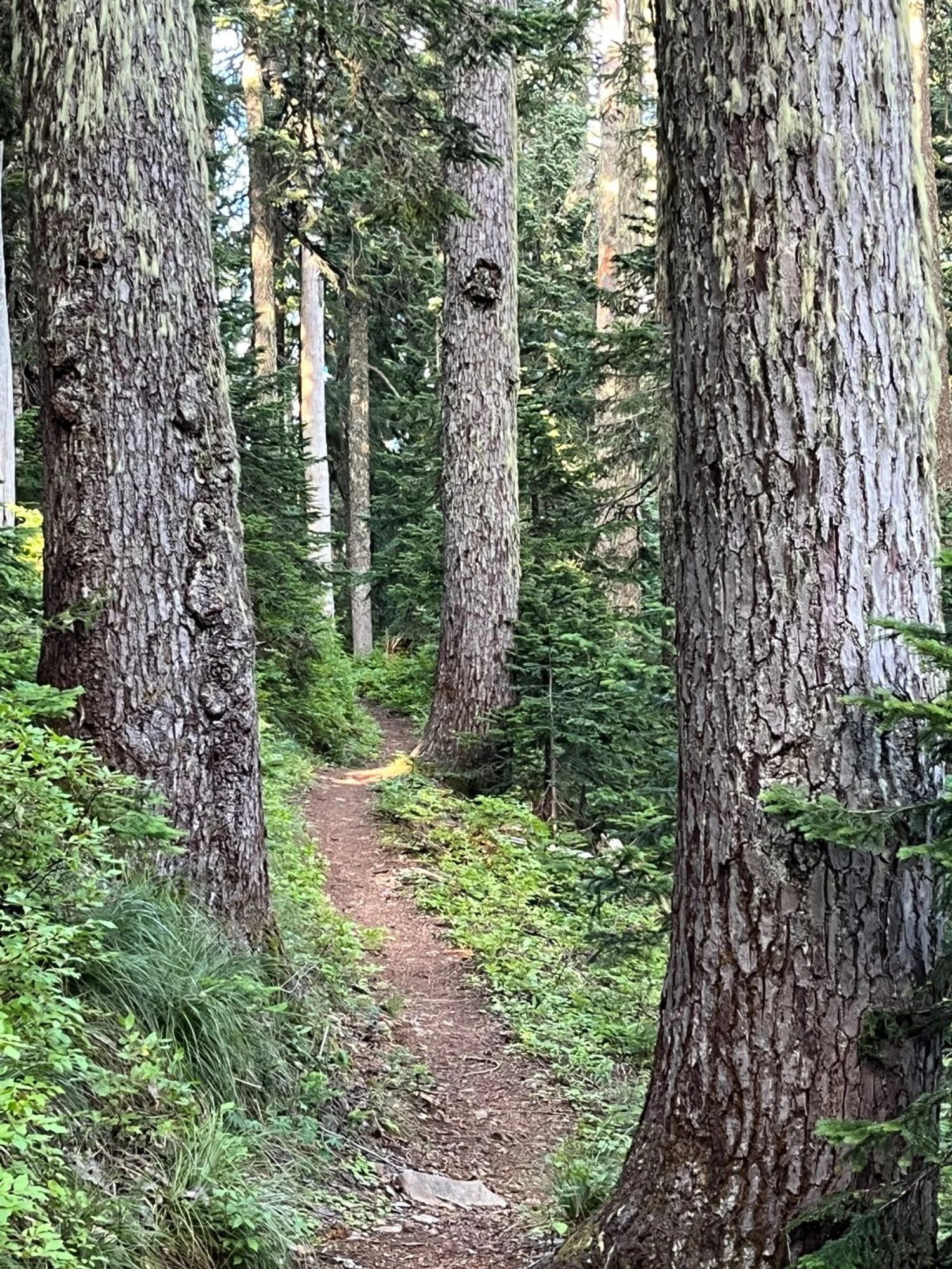 The trail enters gorgeous old forest about a mile up the trail, continuing for another mile to the PCT junction. Large Pacific silver fir dominate at first, but as the trail winds around the ridge onto southeast-facing slopes towering noble fir become prominent. The blue-hued noble fir and silver-barked silver fir are an exemplar for the type and quite distinct from the low-elevation old growth at the start of the trail.