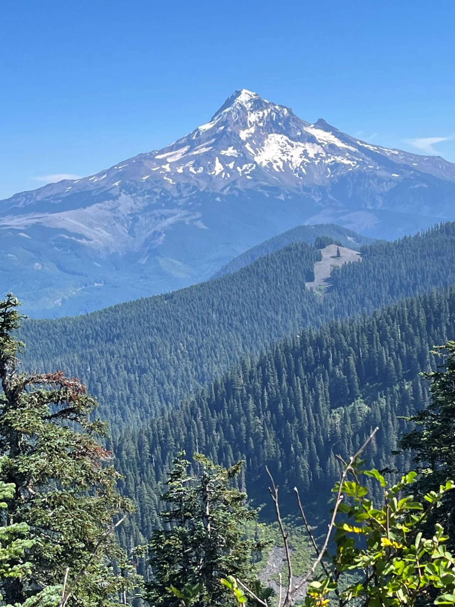 It’s less than a half mile up the Buck Peak Trail to the summit where a spectacular view awaits. The forest atop Buck Peak has grown in and obscured views of the landscape to the north, but a broad panorama to the east and southeast remains showcasing Mt. Hood and Lost Lake. Note that the trail junction was unsigned and the trail was heavily brushed in as of August, 2024, but both are scheduled to be remedied by the end of the year.