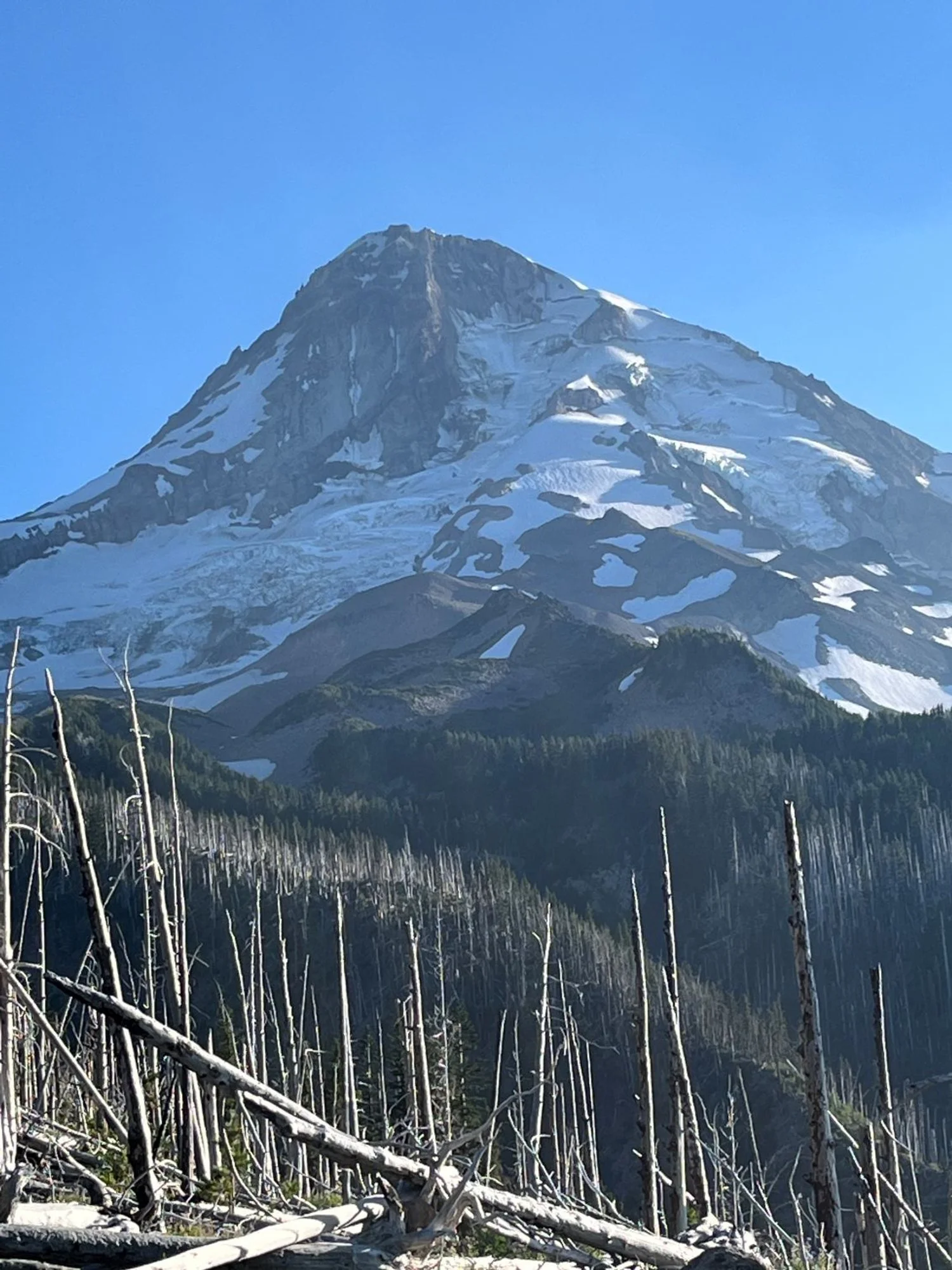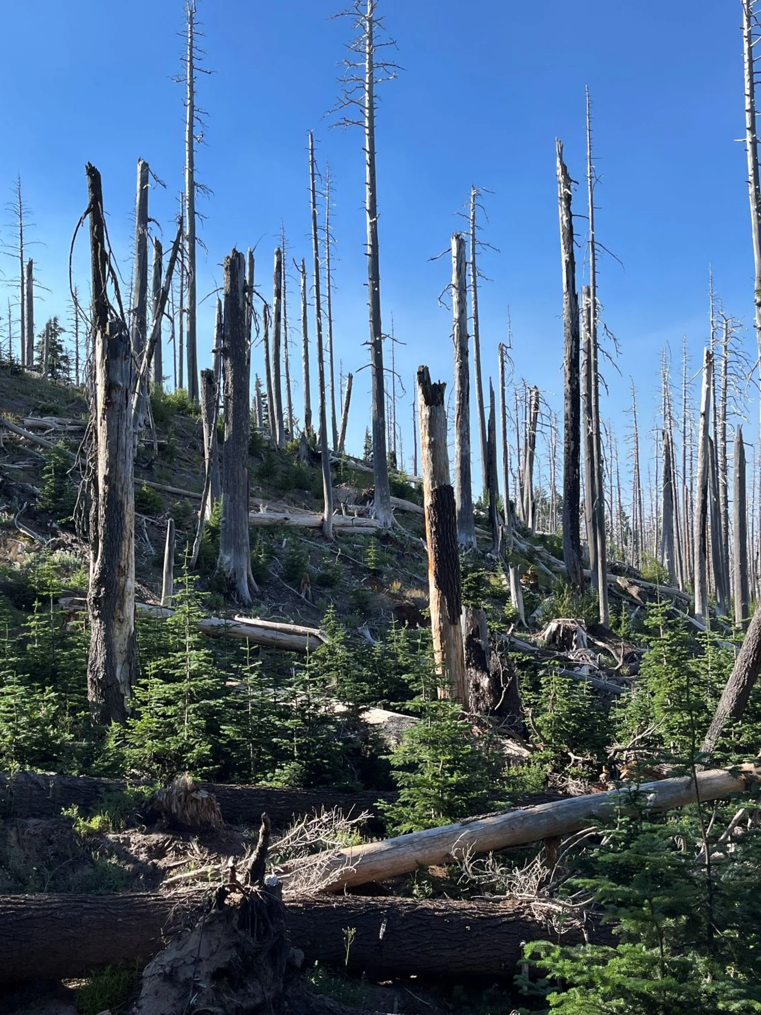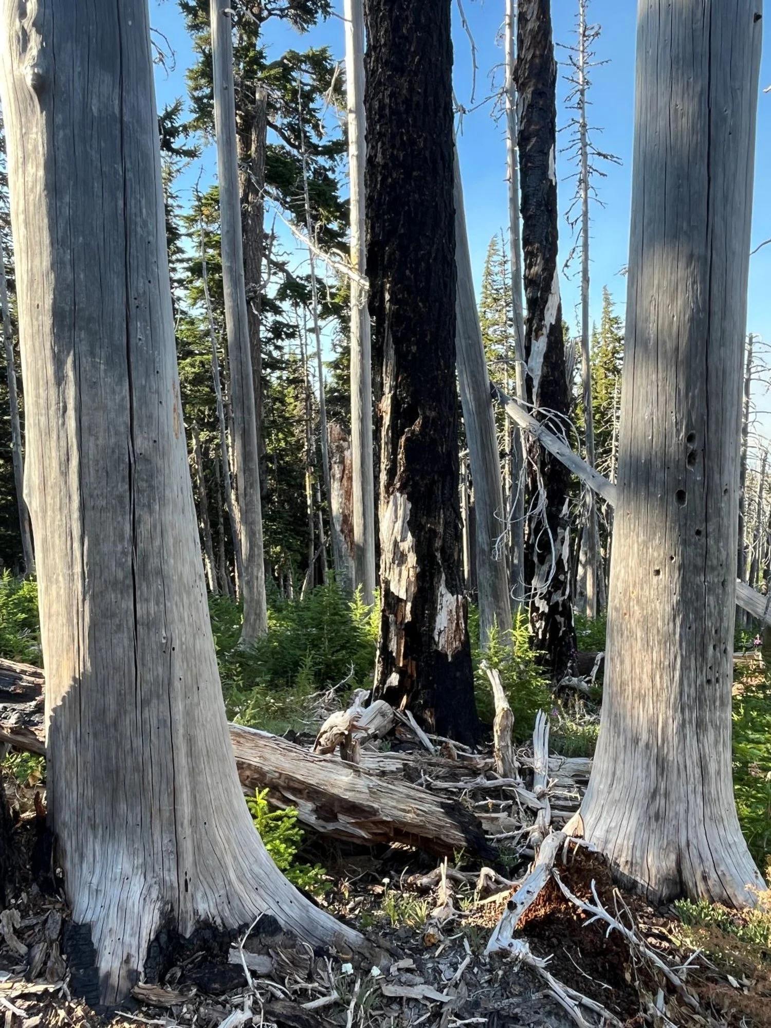 The largest mountain hemlock and Pacific silver fir are slowing dying out. The Gnarl Ridge Fire (2008) severely burned the landscape along the access road up to the trailhead, and over the Tilly Jane Trail itself in one place.