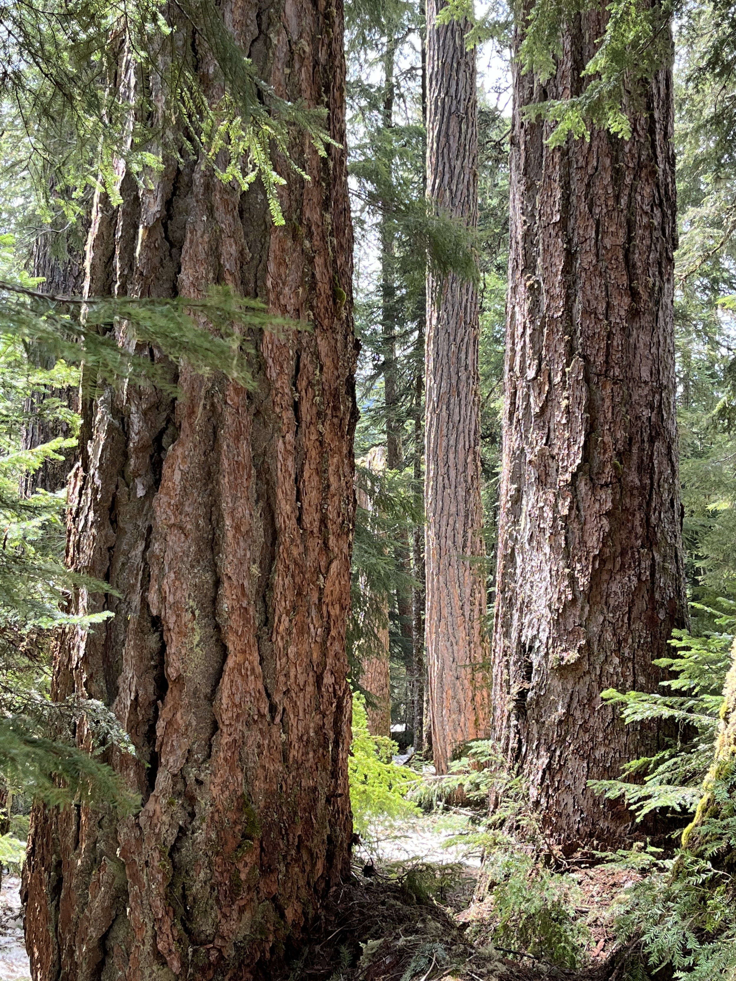 Huge Douglas-fir up to 5-7’ thick and chunky western hemlock 3-4’ thick dominate the overstory along all three segments. The upper canopy is starting to break up in places creating sun gaps occupied by a thick understory of young trees, including an abundance of Pacific silver fir, common at higher elevations. Deep duff mounds around some of the larger trees attest to the great age of these surviving titans.