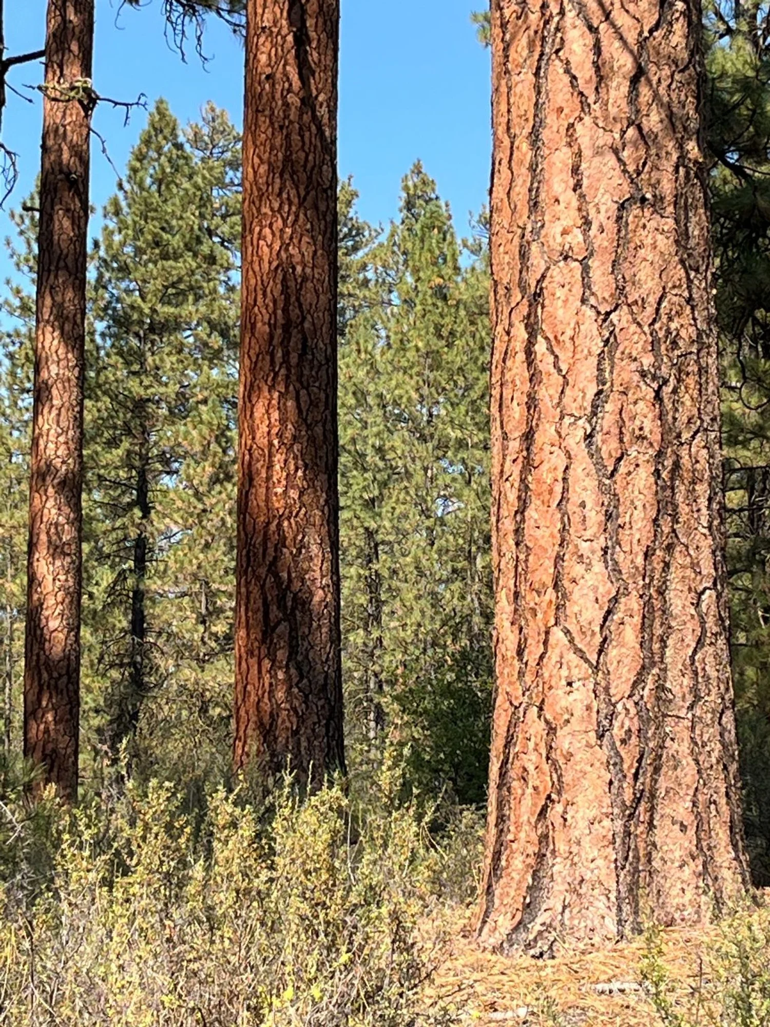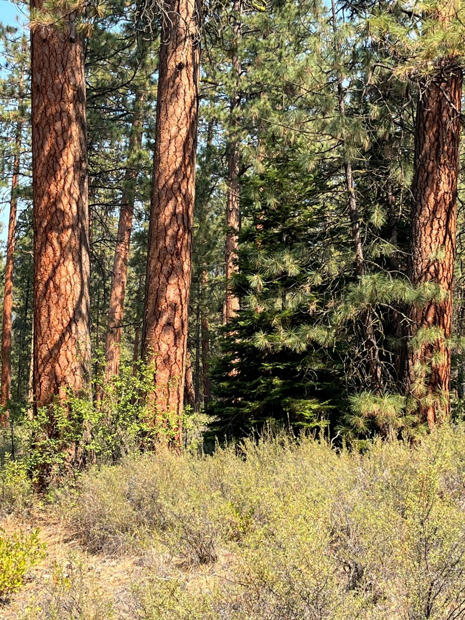 Portions of the forest on the flat above the river have had prescribed fire applied, reducing the amount of understory vegetation and maintaining an open stand featuring large ponderosa pine.