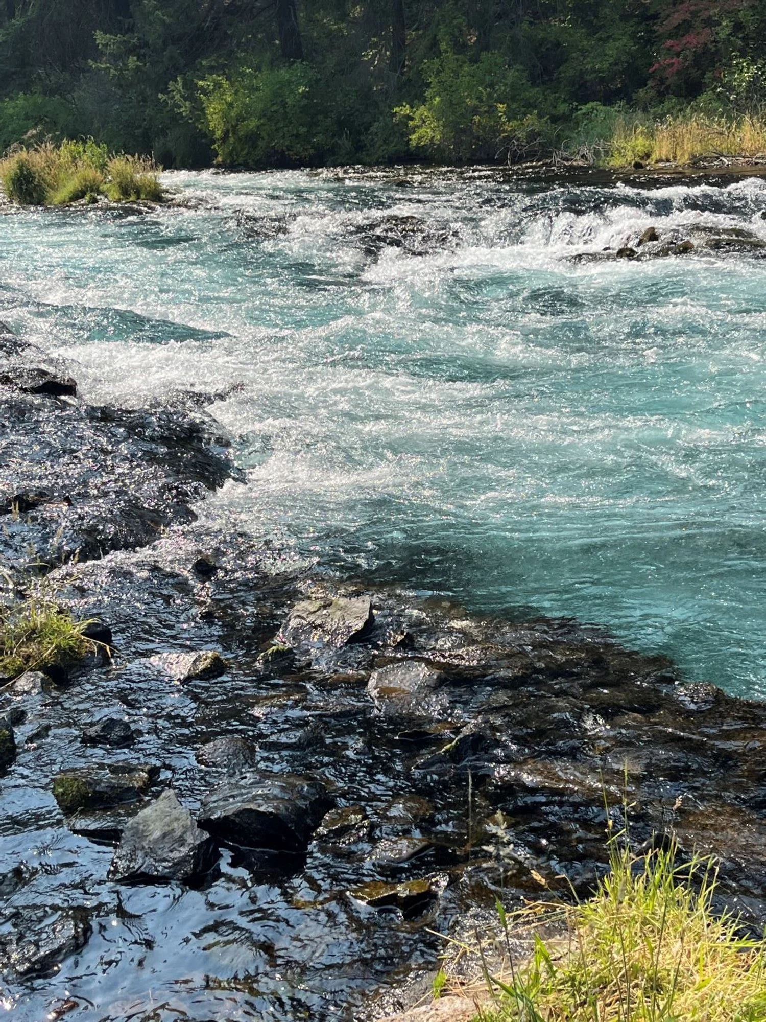 The river alternates between placid and frothy in this less well-traveled section of the trail. Old Douglas-fir become prominent in the gorge where the gorge wall to the east provides a bit more shade. The trail continues north to the parking lot by Wizard Falls Fish Hatchery. Big pines again dominate after the trail emerges from the gorge, and stunning views of the river are frequent along this portion of the hike.