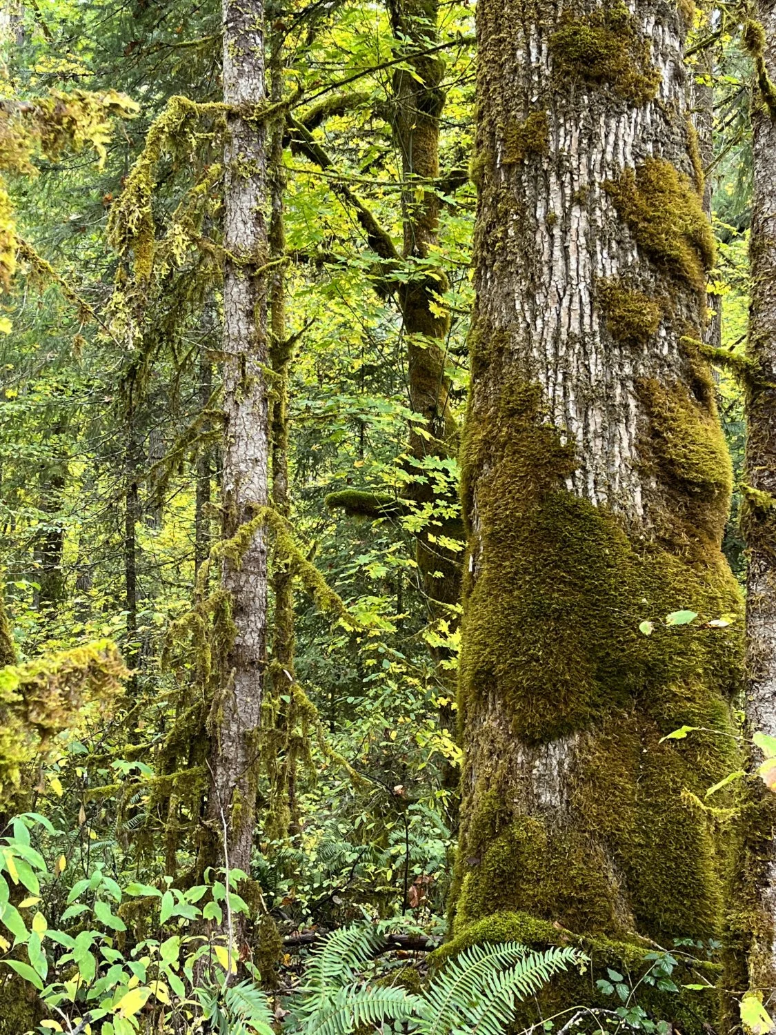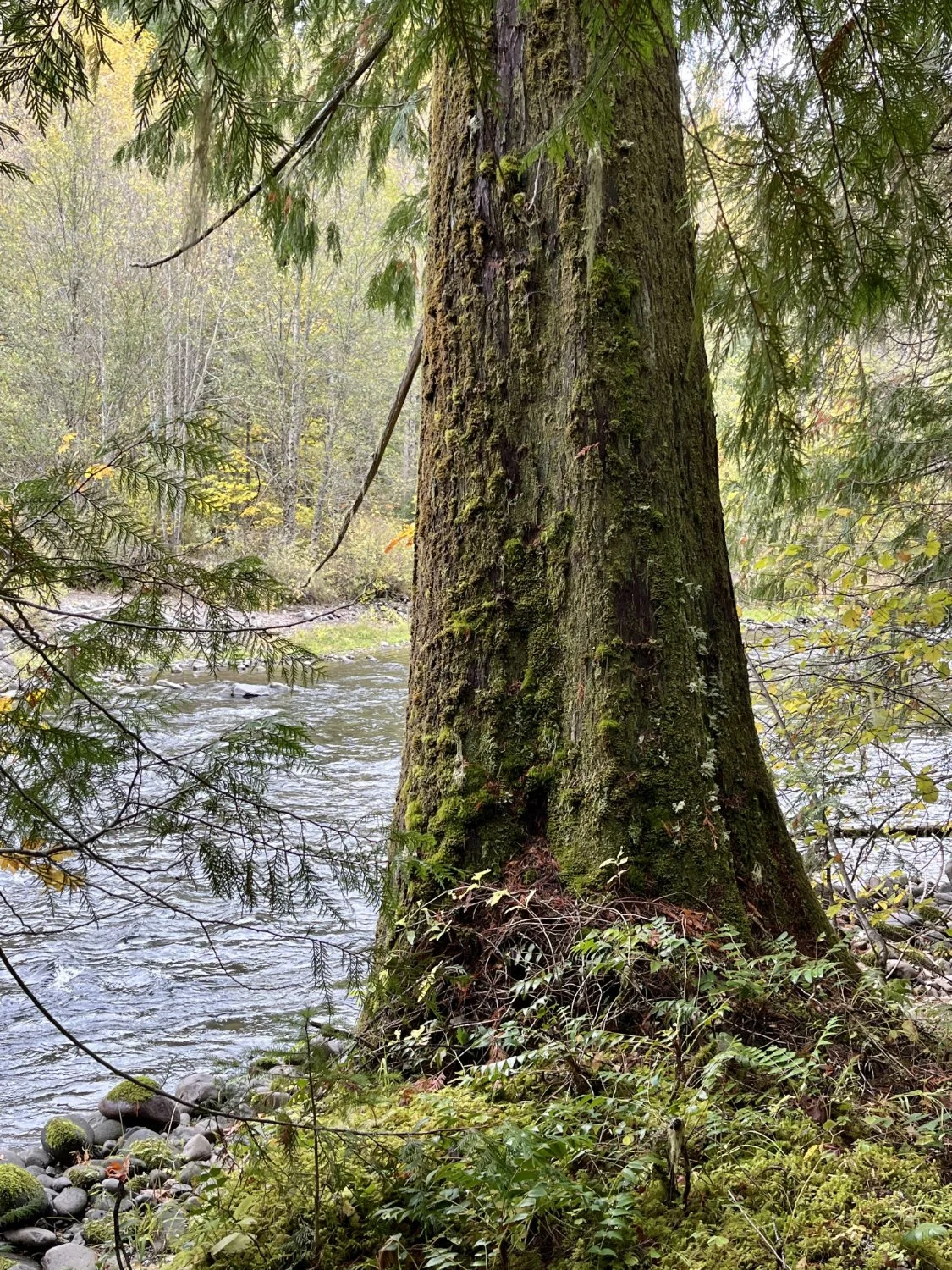 Hikers enter a small riparian grotto rimmed by a short, ferny cliff a mile or so past the bridge. Huge western redcedar and Douglas-fir pack the shoreline. Western hemlock and western redcedar become more abundant over the next mile and a half until an extensive terrace featuring moss-cloaked maples is reached. Big cottonwoods and Douglas-fir also dot the terrace floor. This gorgeous spot is especially striking in the fall when changing deciduous leaves paint the scene bright yellow. The trail continues downstream, but the terrace makes a sensible turnaround point.