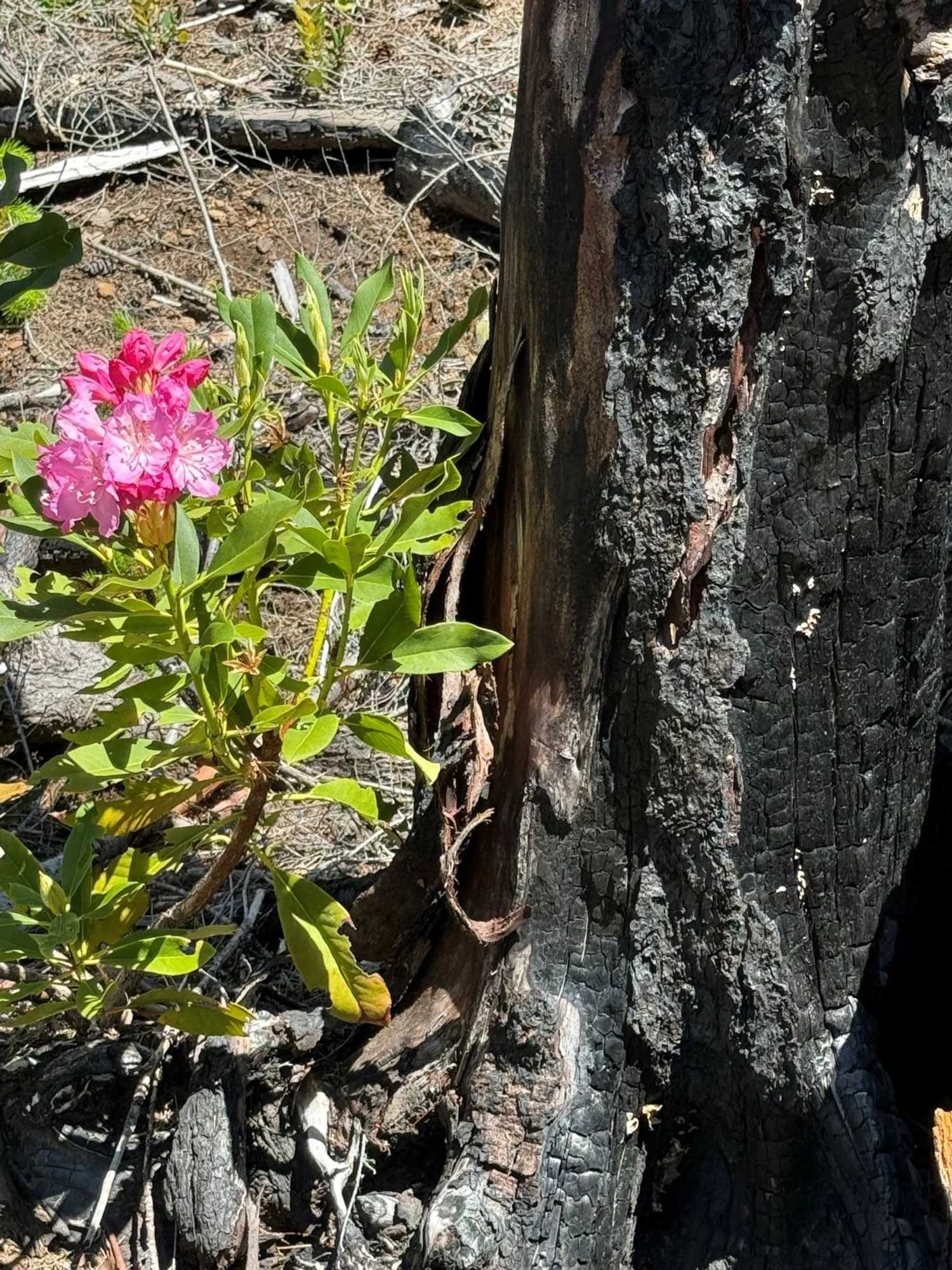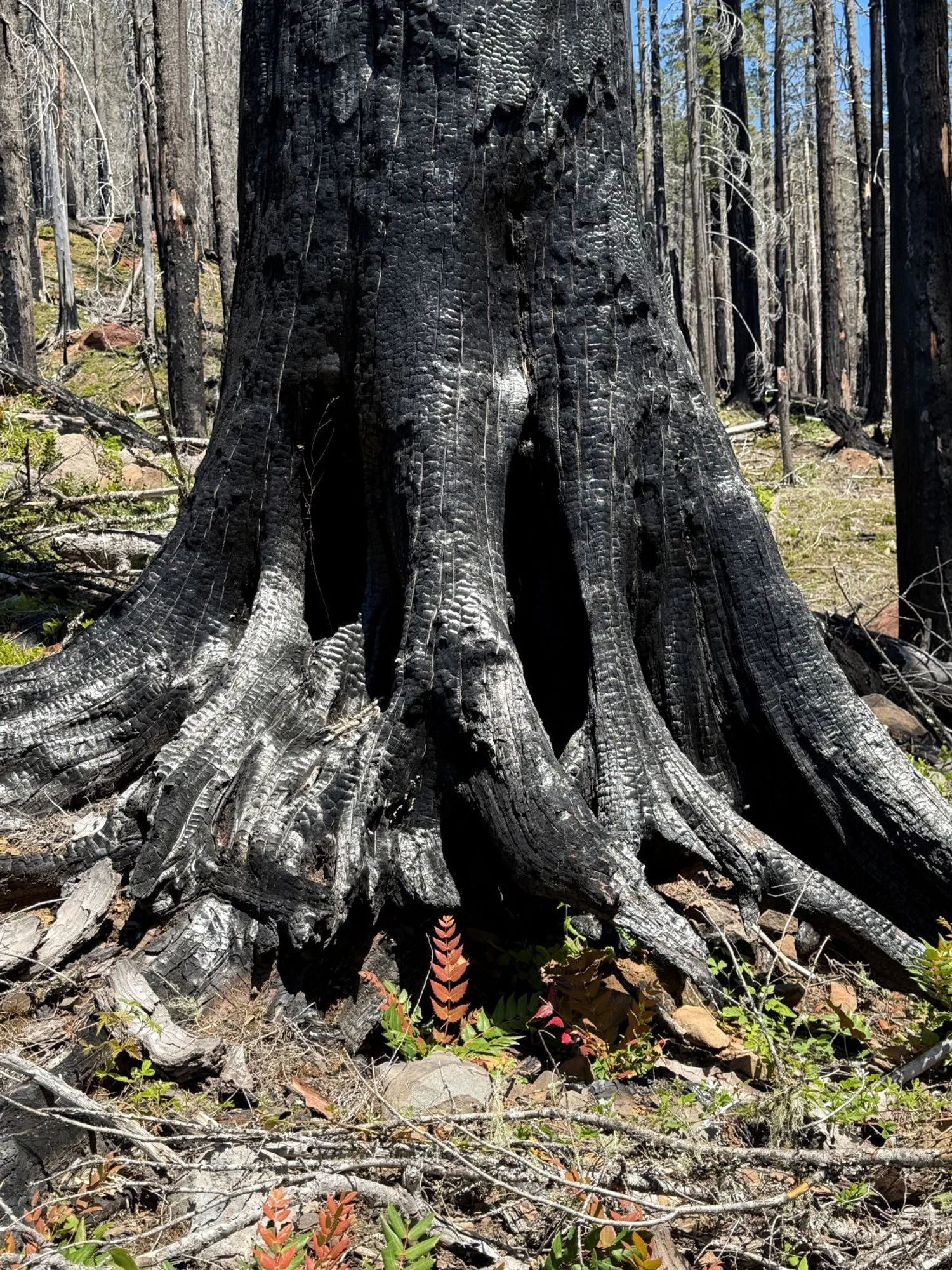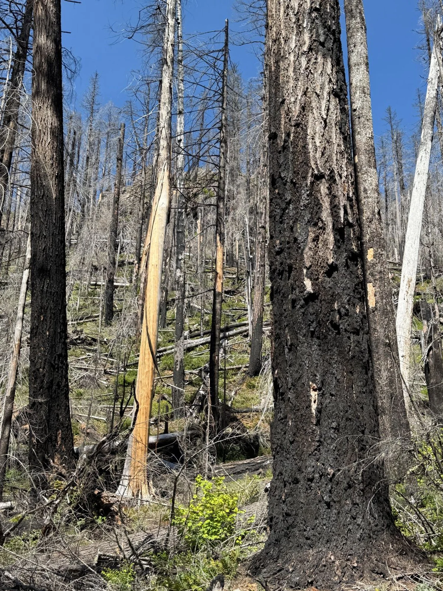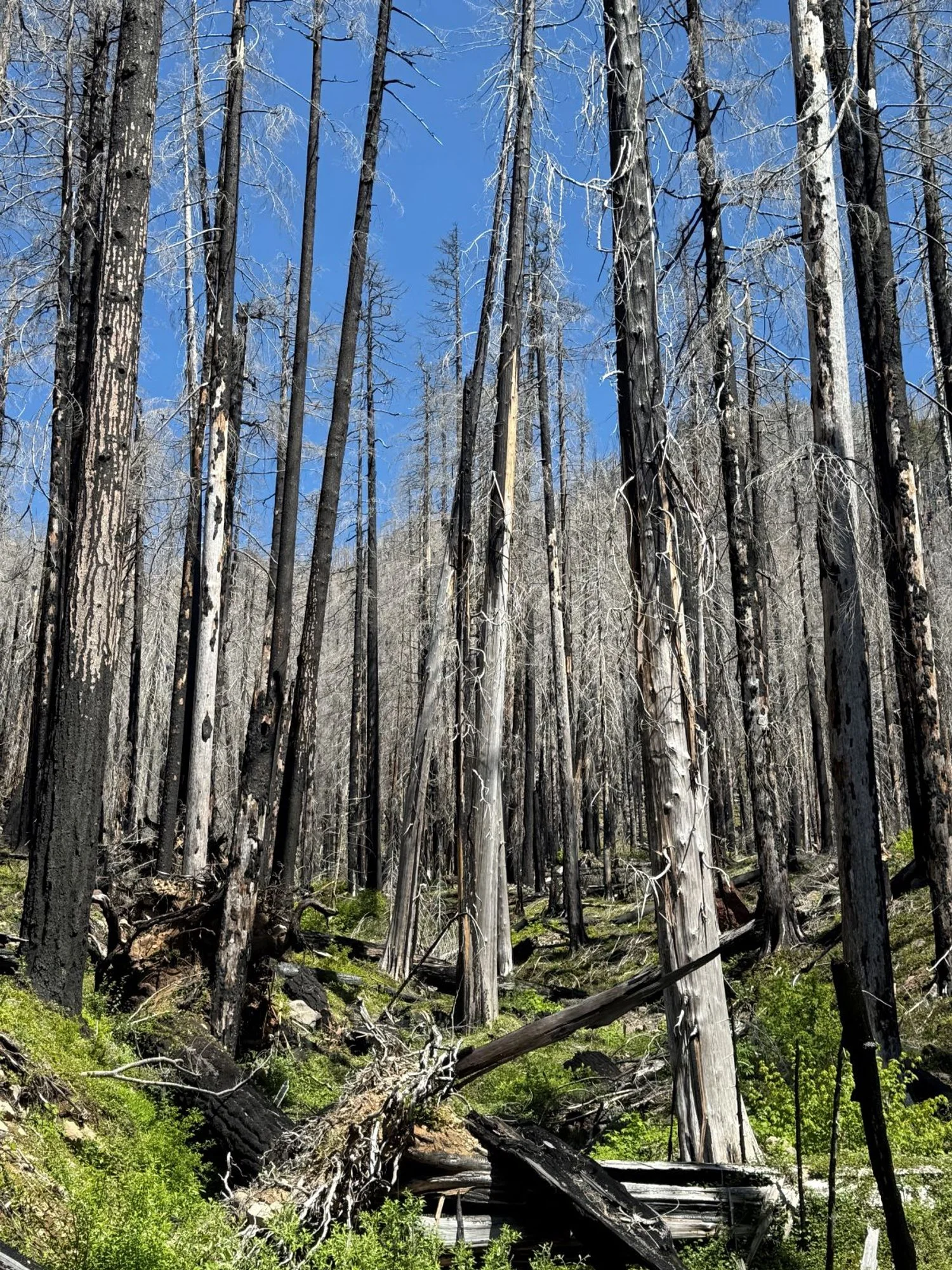 The Cheat Creek Trail parallels Cheat Creek on the way to a trail junction on the ridgeline between Triangulation Peak and the Sentinel Hills. Old-growth conifers used to border the trail up to Wild Cheat Meadows where Alaska yellow cedar encircled the meadow. However, the Whitewater Fire (2018), and then the Lionshead Fire (2020), burned through this watershed at high severity leaving a harsh and rocky landscape behind. The trail was reopened at the end of 2024, but most of the forest near the trail severely burned and falling trees and branches rapidly accumulate over the trail. A few old-tree survivors remain along a short stretch of trail about a mile and a half from the trailhead, but most trees died around the meadow complex.