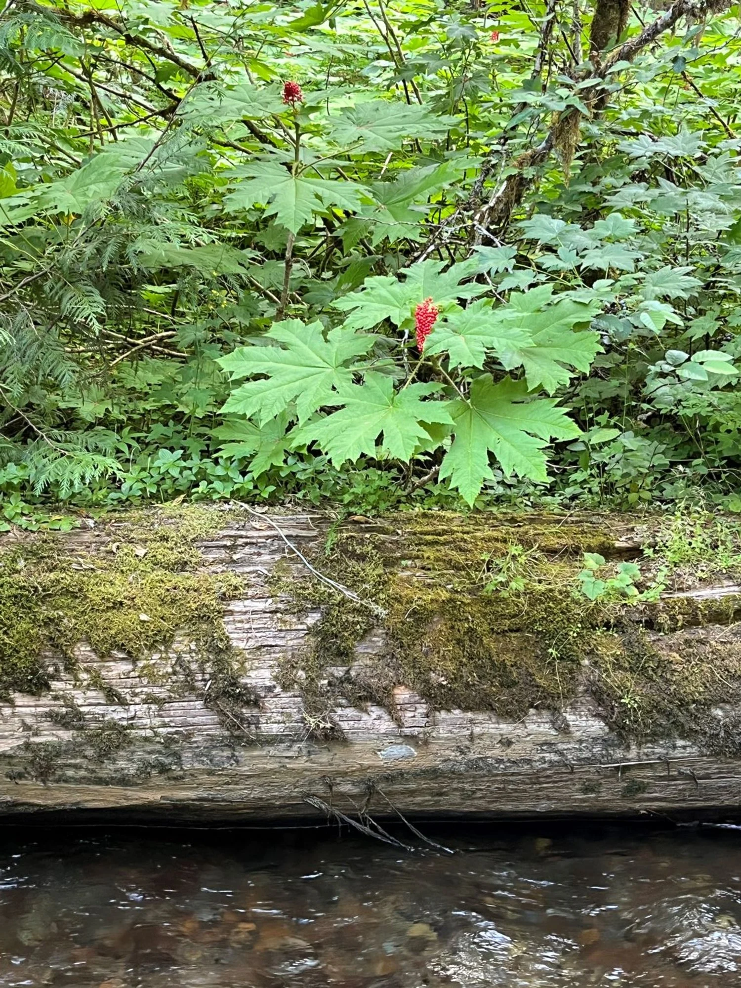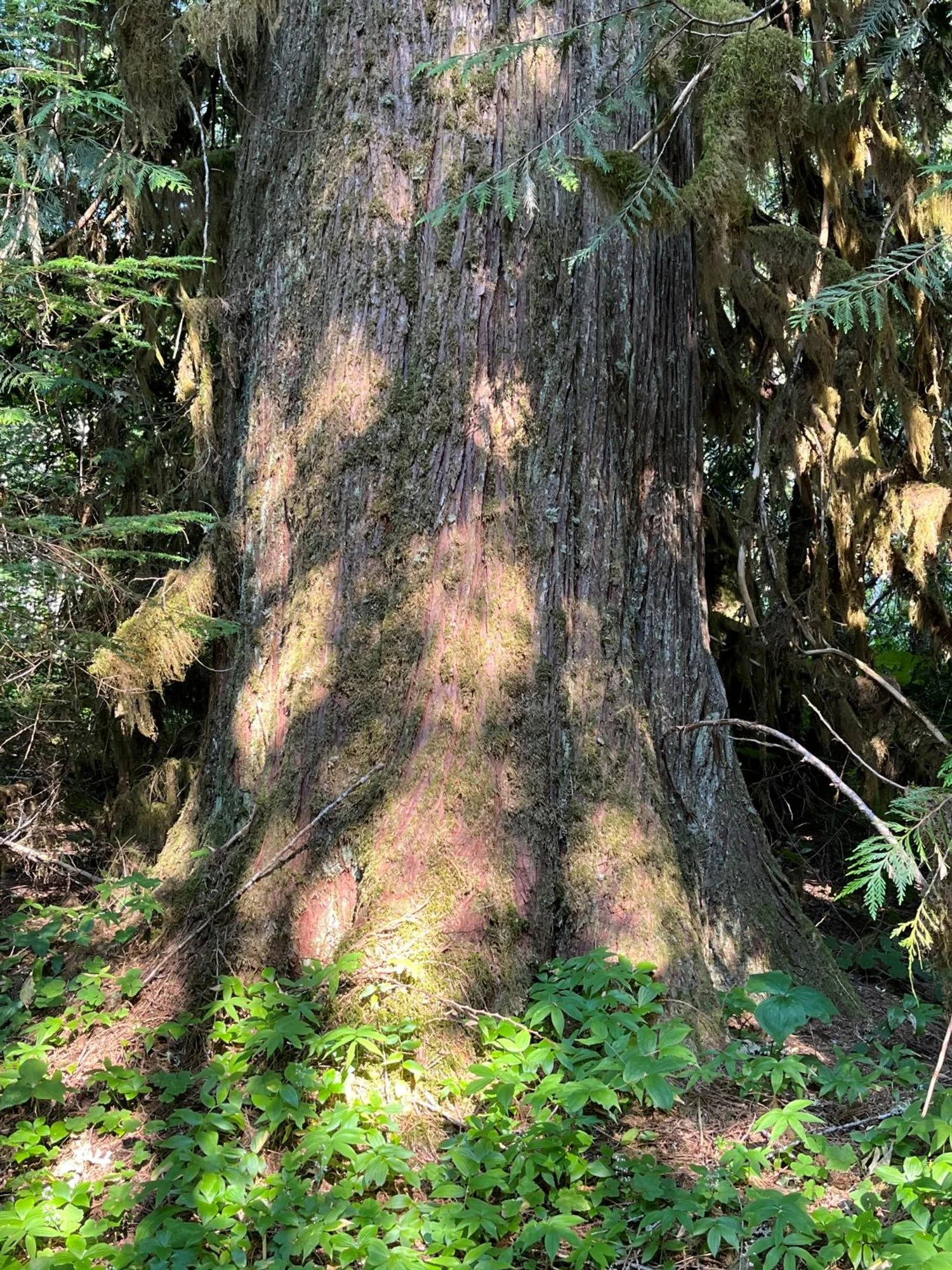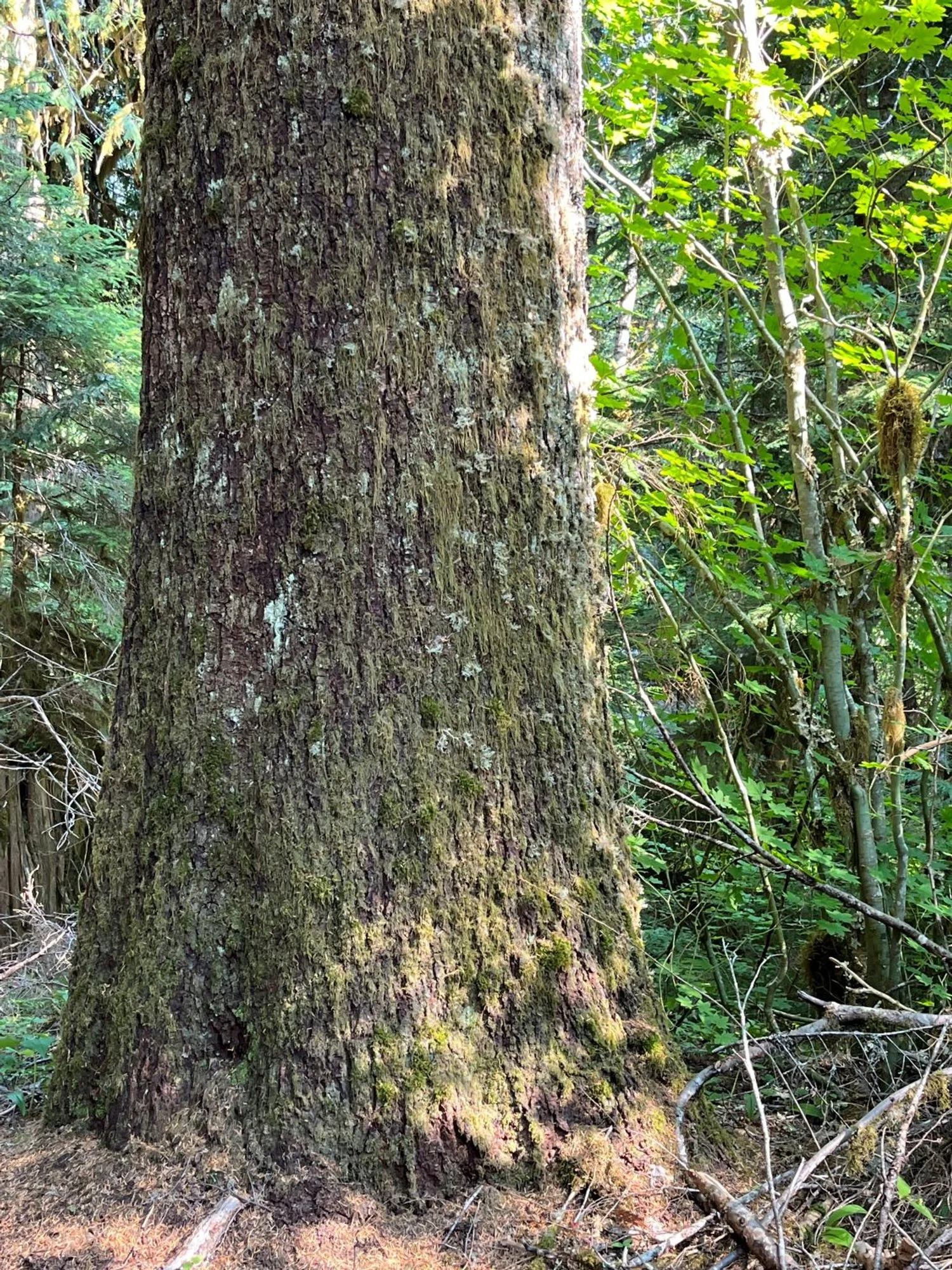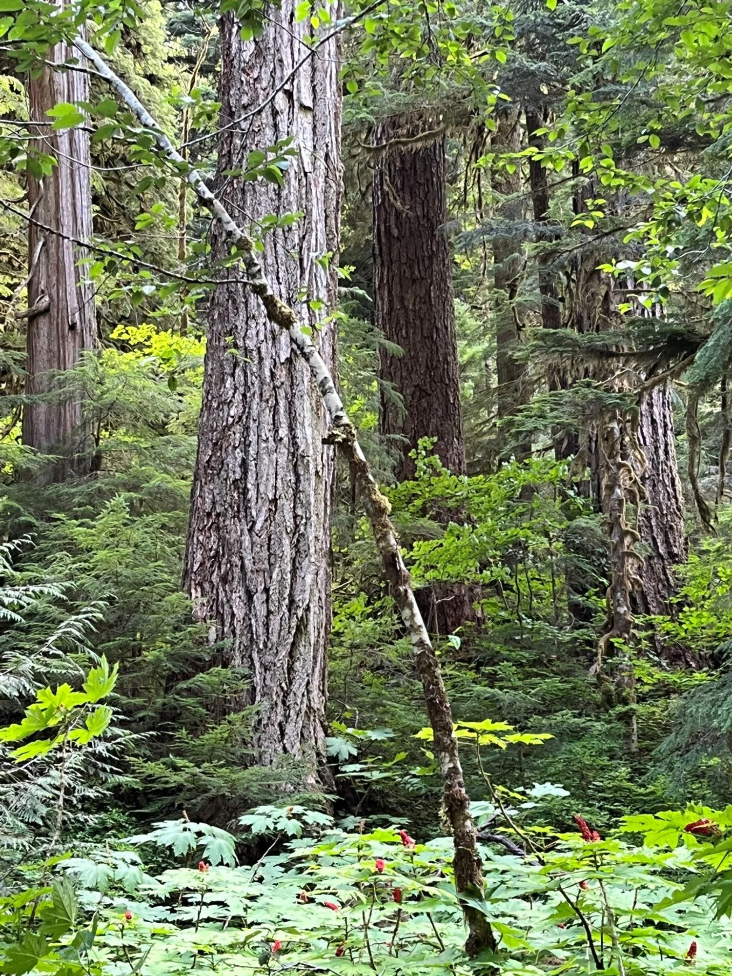 The forest features Douglas-fir, noble fir, western redcedar, western hemlock and Pacific silver fir. Most larger trees are in the 200–300-year-old range, though some are quite large. An attractive, somewhat older stand lies just across the creek.