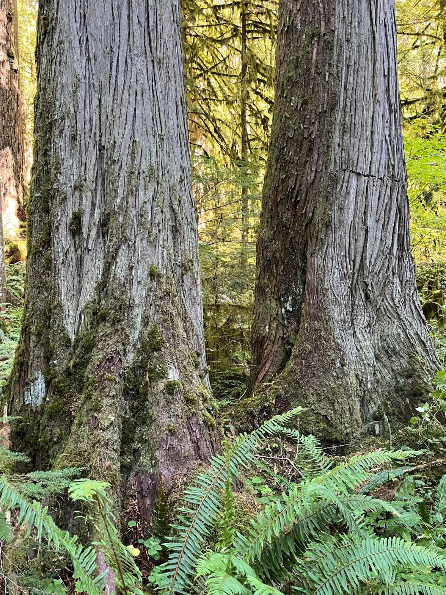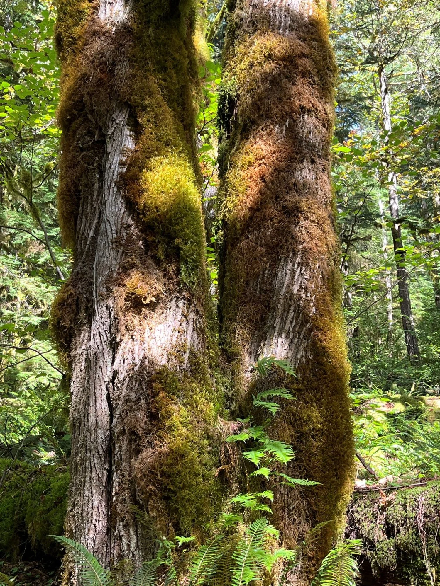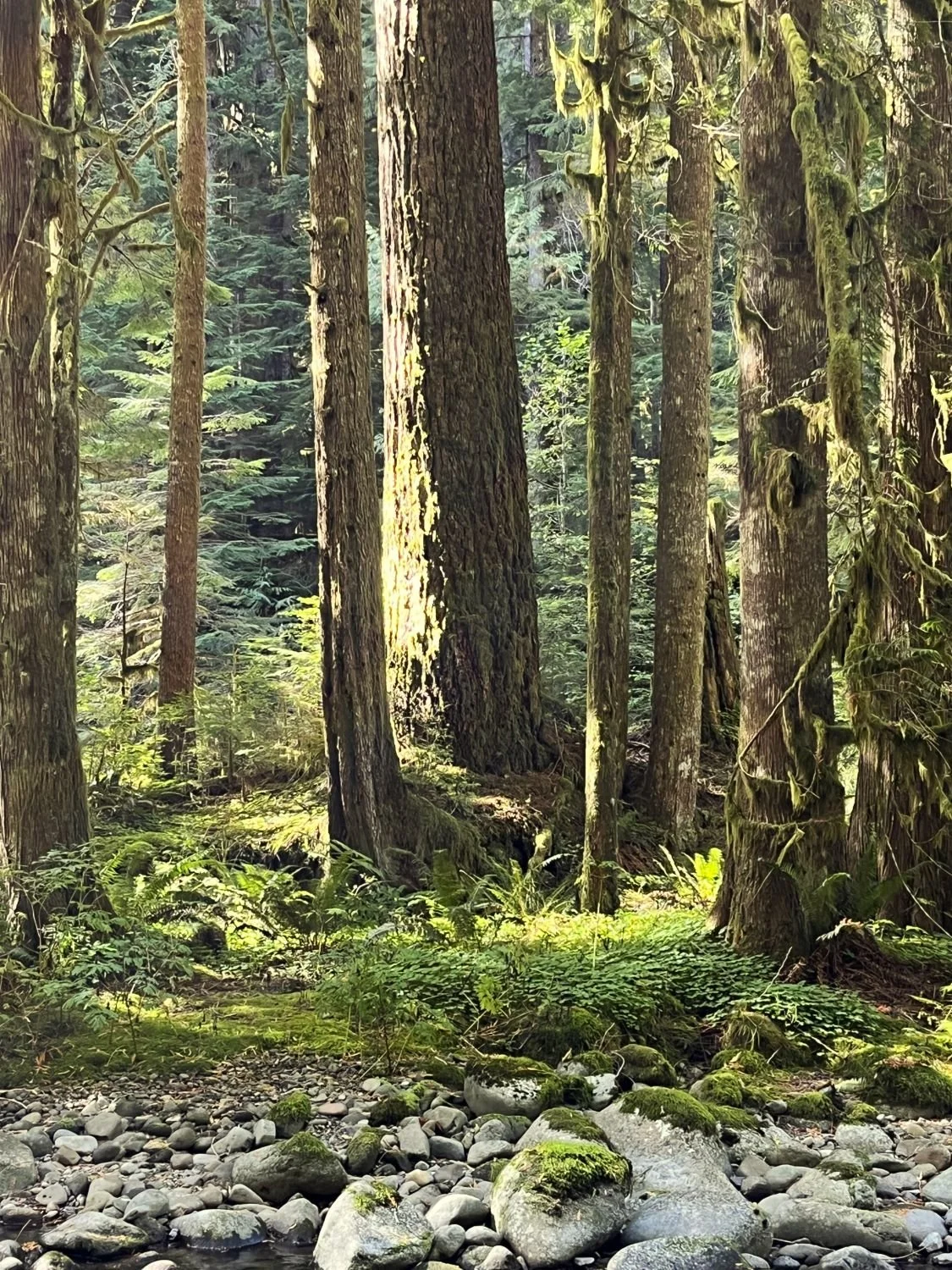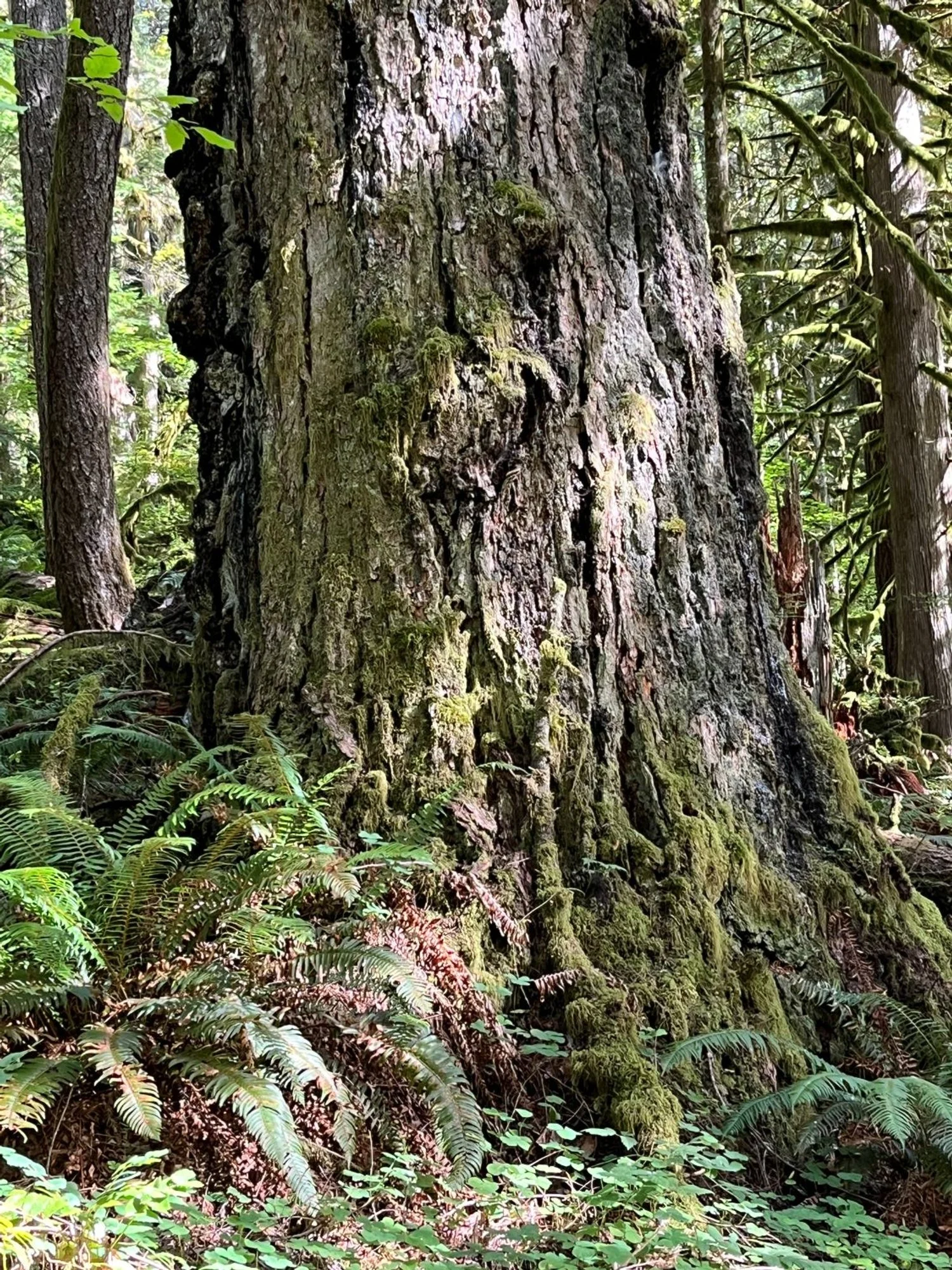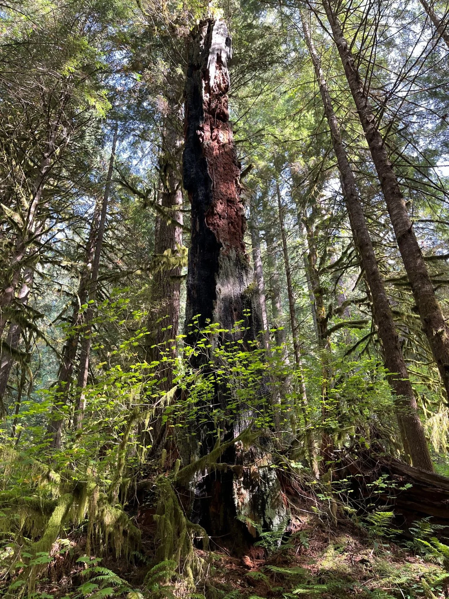 Immense (5-7’ thick), fire-scorched Douglas-fir are scattered across the lower slopes along Eagle Creek, survivors from the old forest that pre-dated widespread and repeated fires in the mid- to late-nineteenth century and early twentieth century. Abundant stubby snags from that generation are in the final stages of decomposition, many colonized by young hemlocks. The general forest canopy is now composed of a post-fire generation reaching 3-4’ in diameter.