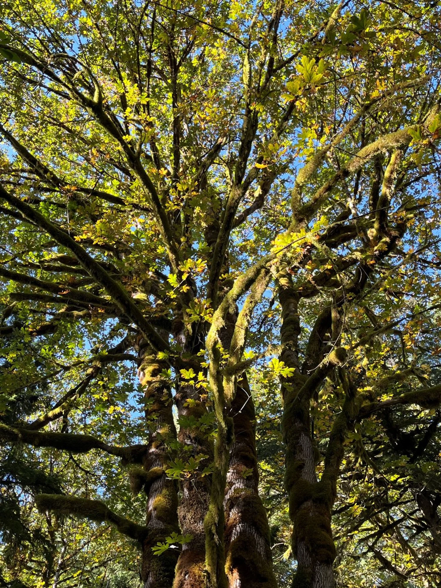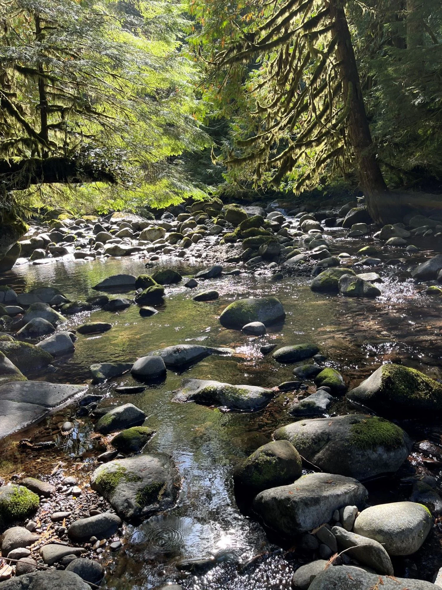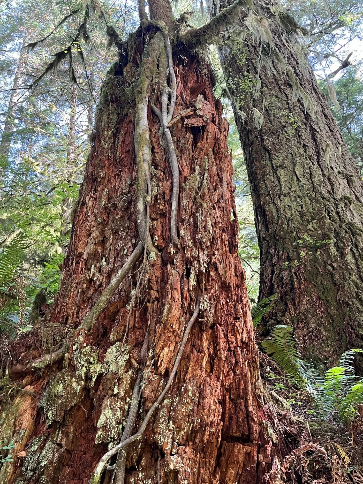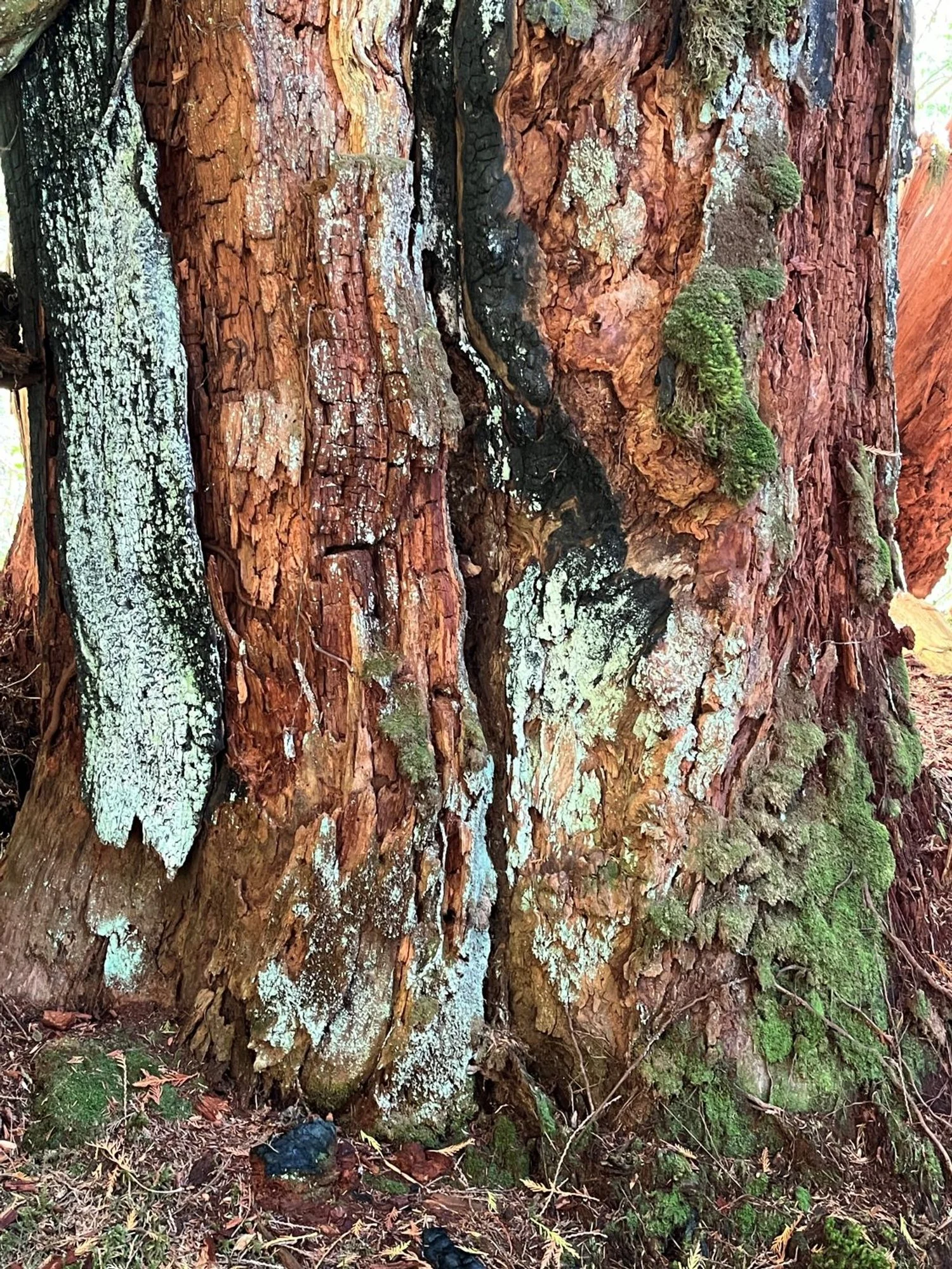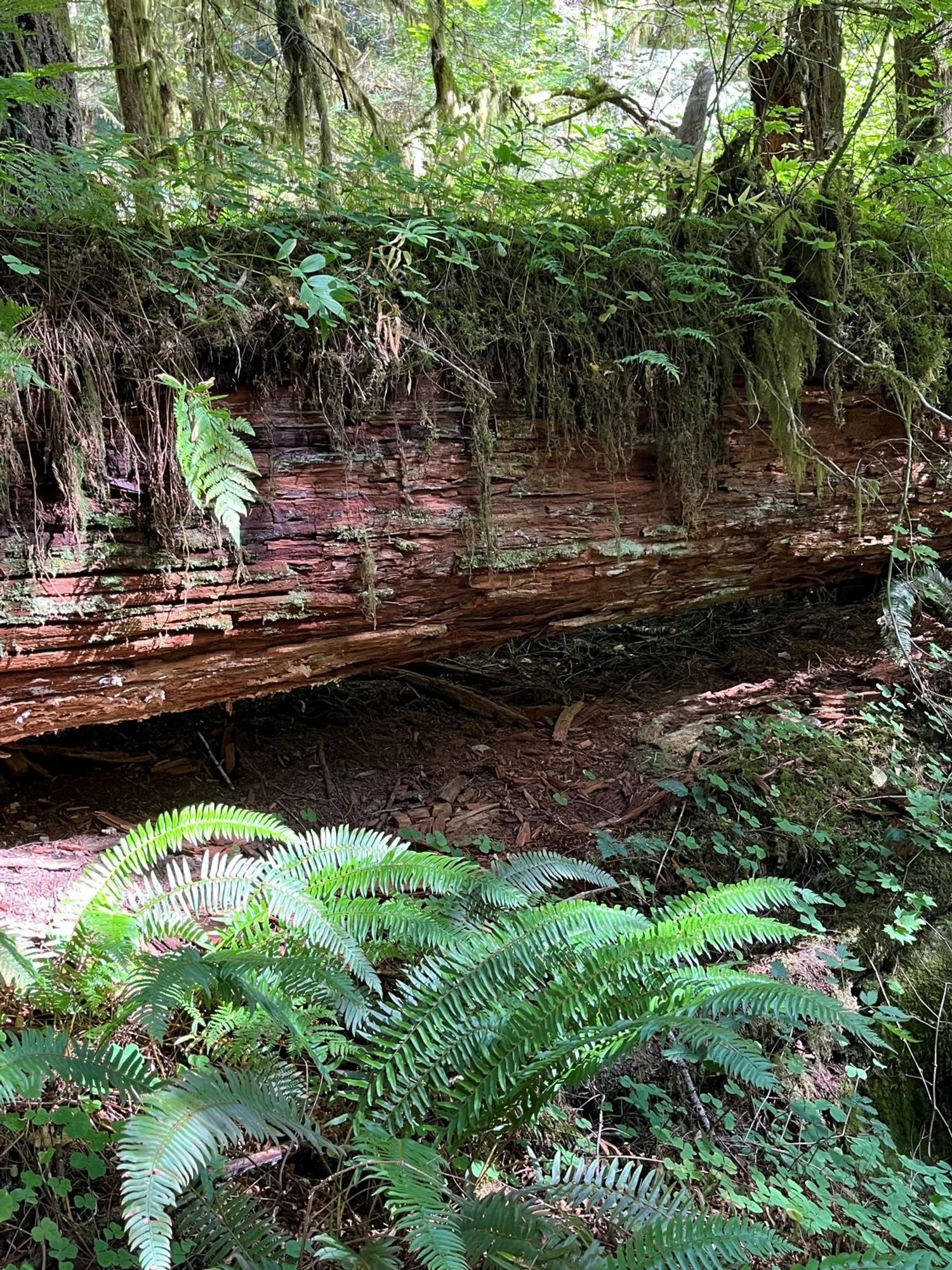 Immense (5-7’ thick), fire-scorched Douglas-fir are scattered across the lower slopes along Eagle Creek, survivors from the old forest that pre-dated widespread and repeated fires in the mid- to late-nineteenth century and early twentieth century. Abundant stubby snags from that generation are in the final stages of decomposition, many colonized by young hemlocks. The general forest canopy is now composed of a post-fire generation reaching 3-4’ in diameter.