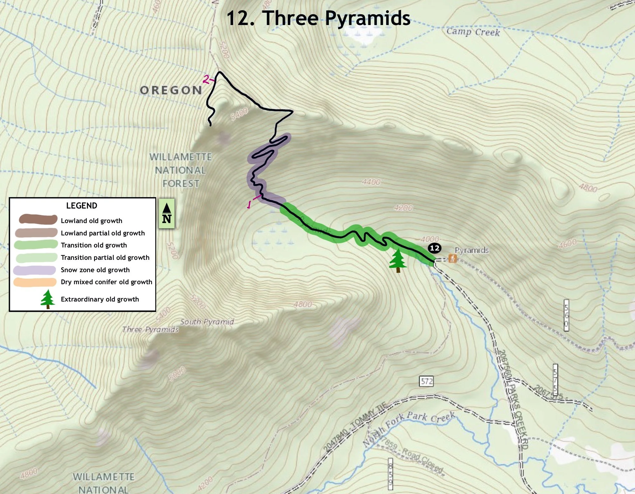 This diverse hike switchbacks up through a fine stand of noble fir old growth on the way to the scenic summit of Middle Pyramid. Together with sister pyramids on both flanks, the Three Pyramids dominate the eastern boundary of the Pyramid Creek watershed. The Pyramids Trail links with several other trails to form a 28-mile loop around the upper Middle Santiam watershed, known as the Old Cascade Crest Loop.