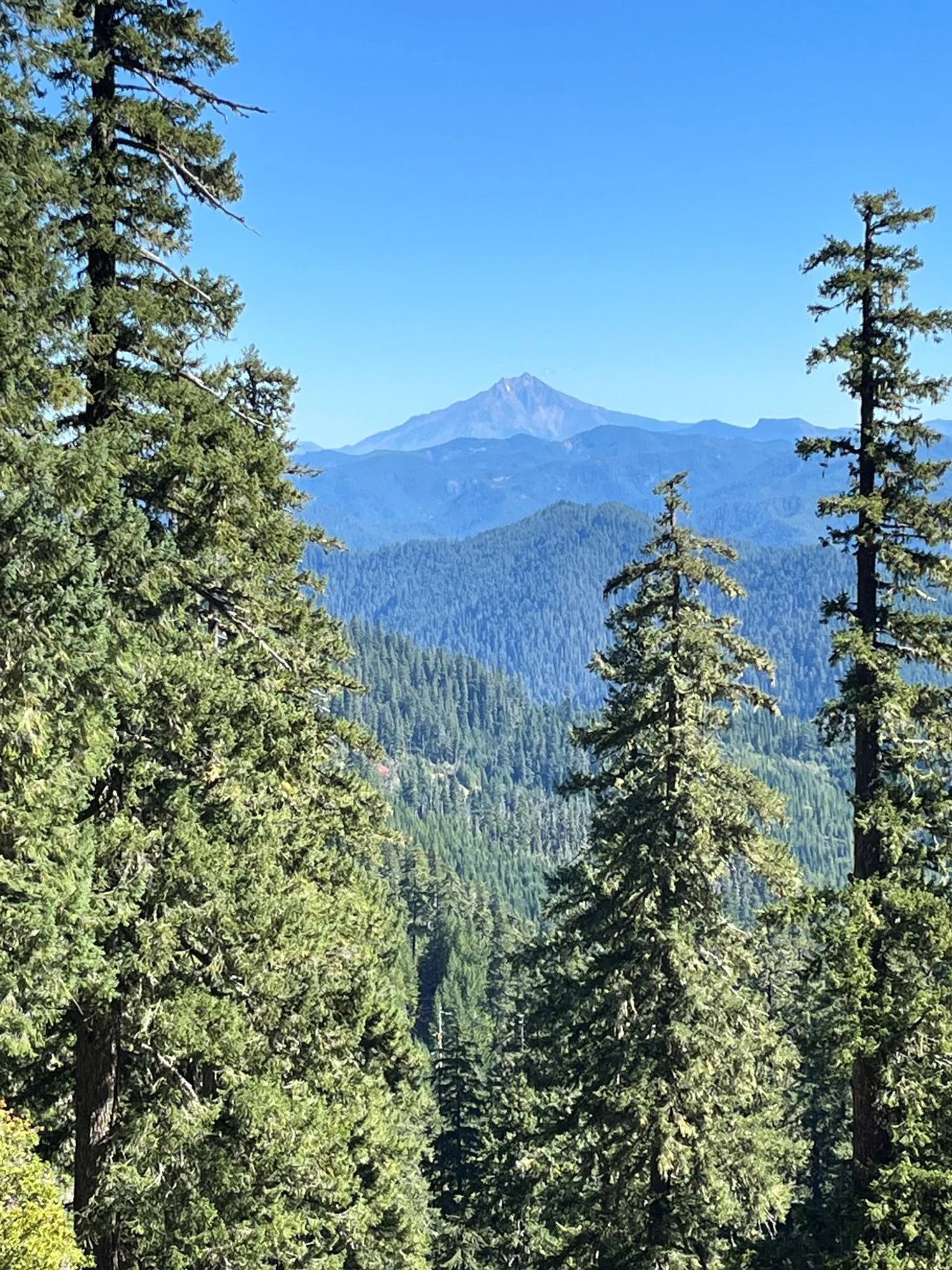 The trail follows old roads for most of the way to Crabtree Lake, and then follows a well-worn user path to a fantastic grove of spectacular veterans. Head southwest from the trailhead on a closed road, soon coming to an opening with a view of the Cascades, including Mount Jefferson poking prominently above the surrounding landscape. The trail continues around the corner on the old road now angling across slope downhill to the north. Old forest borders the trail on the left, and old trees are scattered along the craggy cliffs above the road to the right. Unfortunately, young trees and shrubs on and near the roadbed obscure the view and experience of the old forest. A small landslide and a large, fallen tree require a scramble at one point, and an older plantation borders the trail/road on the right for the last half of this trail segment.