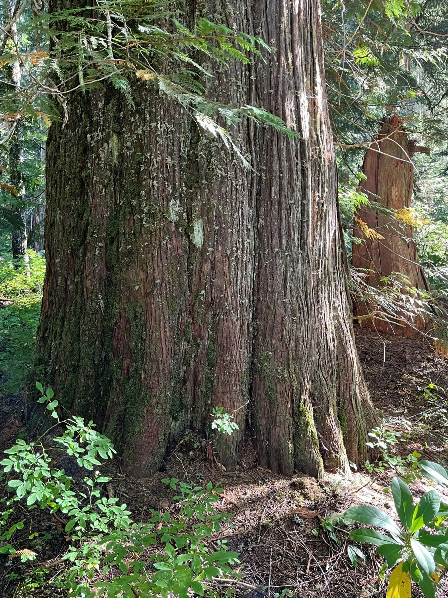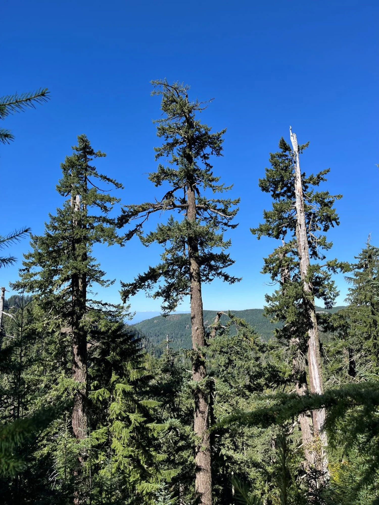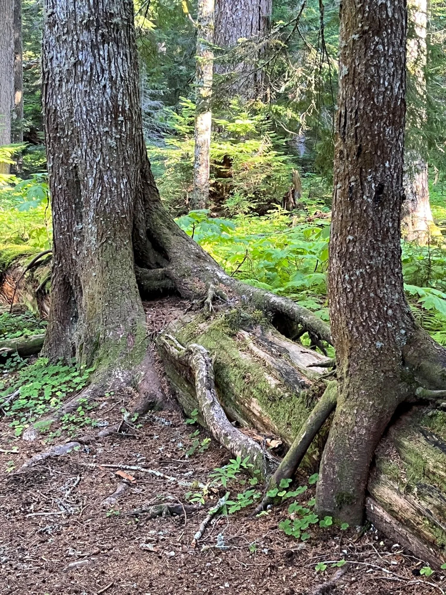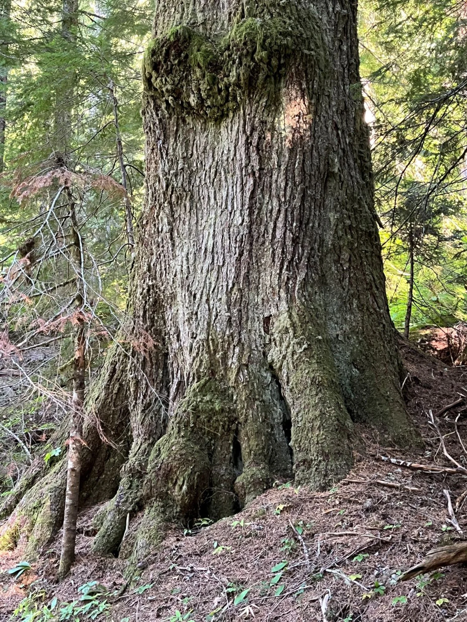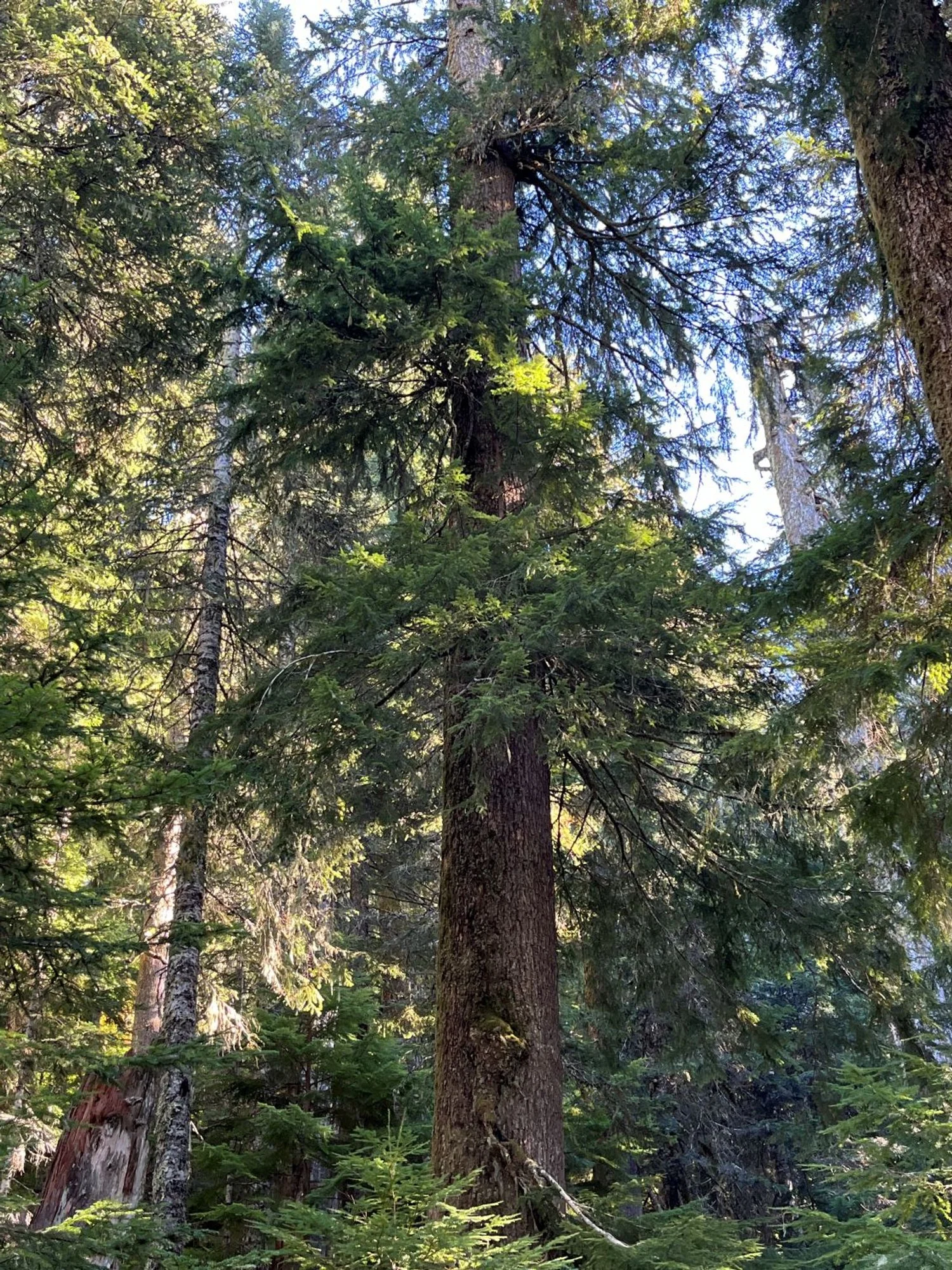 The old-growth grove around Crabtree Lake sits in a north-facing, glacially carved cirque basin, which has afforded an uncommon degree of protection from wildfire. Consequently, the forest has attained great age, often estimated as 600-900-years old. Exceptionally large trees; an abundance of very old western hemlock; huge amounts of large dead wood; and a diverse and gappy forest structure all support the idea that this is a very old forest. One iconic tree in particular, the King Tut tree, is noteworthy for its enormity and distinctive spiraling bark, though it is not near the trail and stands in a difficult to reach location.