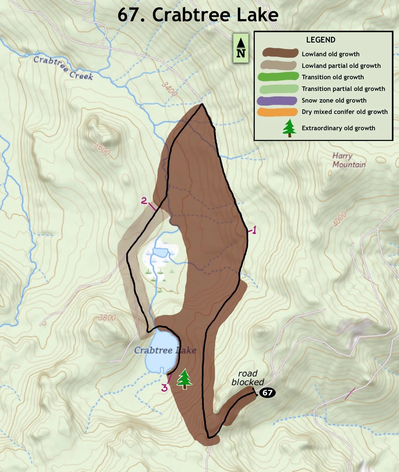 The cliff-rimmed, headwall basin harboring Crabtree Lake is a well-known refugia hosting huge trees in a truly ancient forest. The valley is also a historic conservation landmark due to the protracted and ultimately successful battle to transfer the land from private ownership to the Bureau of Land Management in the 1970s and 1980s. Today the area is a Bureau of Land Management ACEC (Area of Critical Environmental Concern) and RNA (Research Natural Area), meaning that the area is to be managed for environmental and non-impactful research purposes.