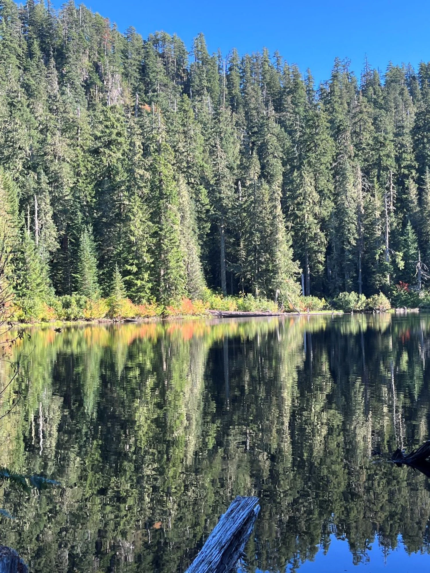 Follow this trail around the north and east shores of the lake, coming to an impressive ancient forest halfway around the eastern shore. Huge western redcedar, western hemlock, Douglas-fir and a few Pacific silver fir stand by the trail. The spellbinding old forest culminates in an amazing grove at the southeastern shore of the lake. Numerous giants 5-7’ thick cluster on this beautiful and highly productive site. Wander a bit and enjoy the forest before heading back the way you came.